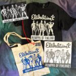 Paketissa: Humppa of Finland 2LP, sinisellä painettu kangaskassi, jääkaappimagneetti ja T-paita