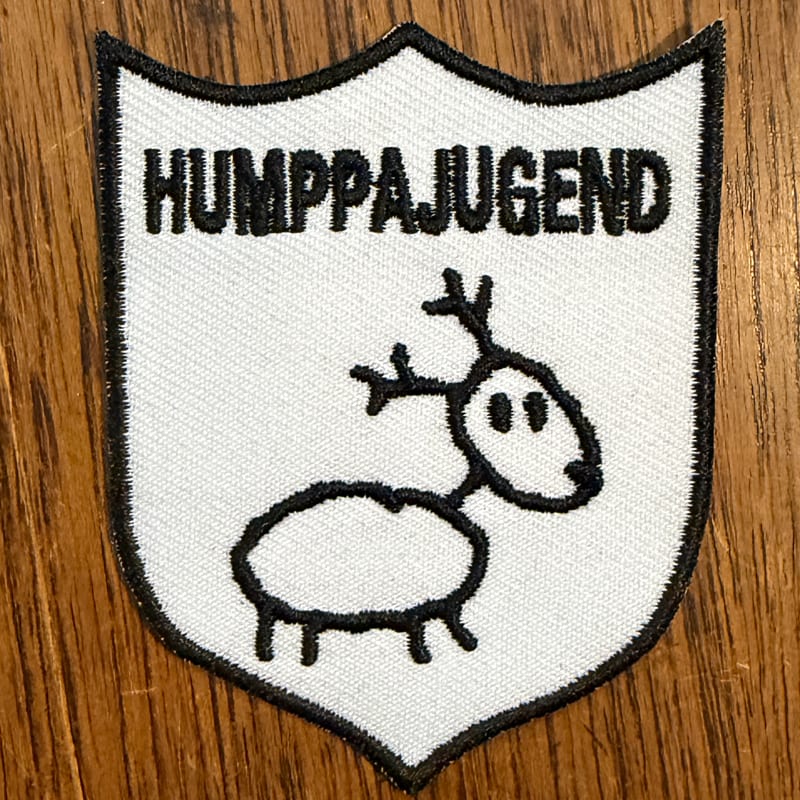 Kangasmerkki Humppaa tai kuole, punaisella tekstillä
